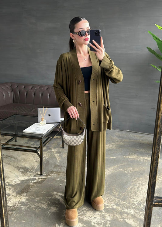 3 AL 2 ÖDEAhşap Düğmeli Hırkalı Takım HAKİ