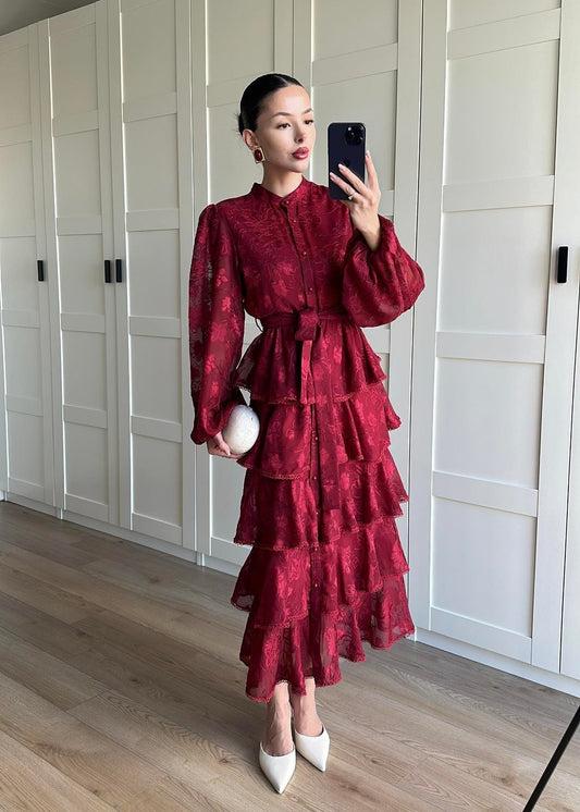 3 AL 2 ÖDEÇiçek Desenli Fırfırlı Elbise BORDO