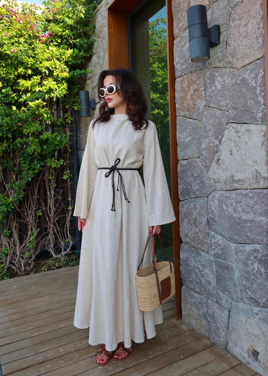 3 AL 2 ÖDEDeri Kemerli Keten Elbise EKRU
