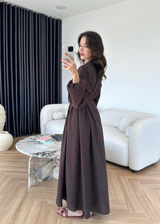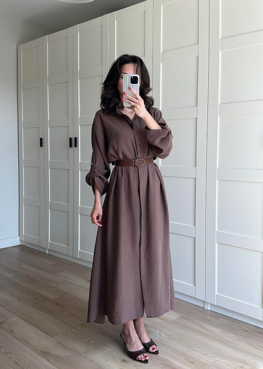 3 AL 2 ÖDETensel Kemerli Gömlek Elbise KAHVERENGİ