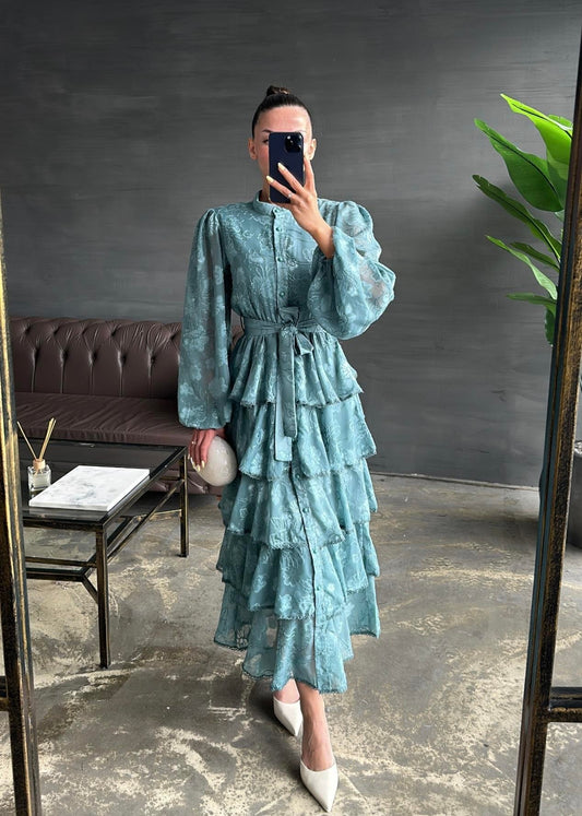 3 AL 2 ÖDEÇiçek Desenli Fırfırlı Elbise MİNT YEŞİLİ
