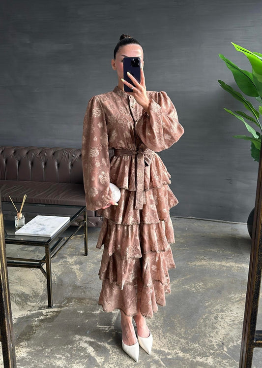 3 AL 2 ÖDEÇiçek Desenli Fırfırlı Elbise KAHVERENGİ